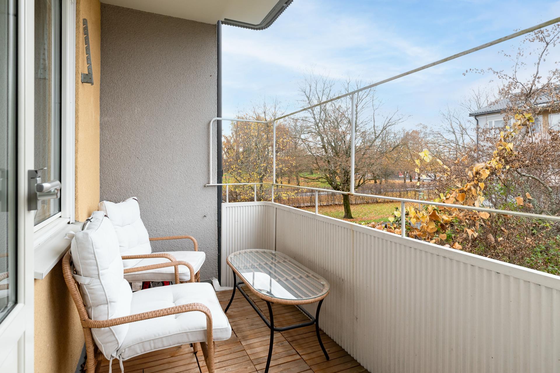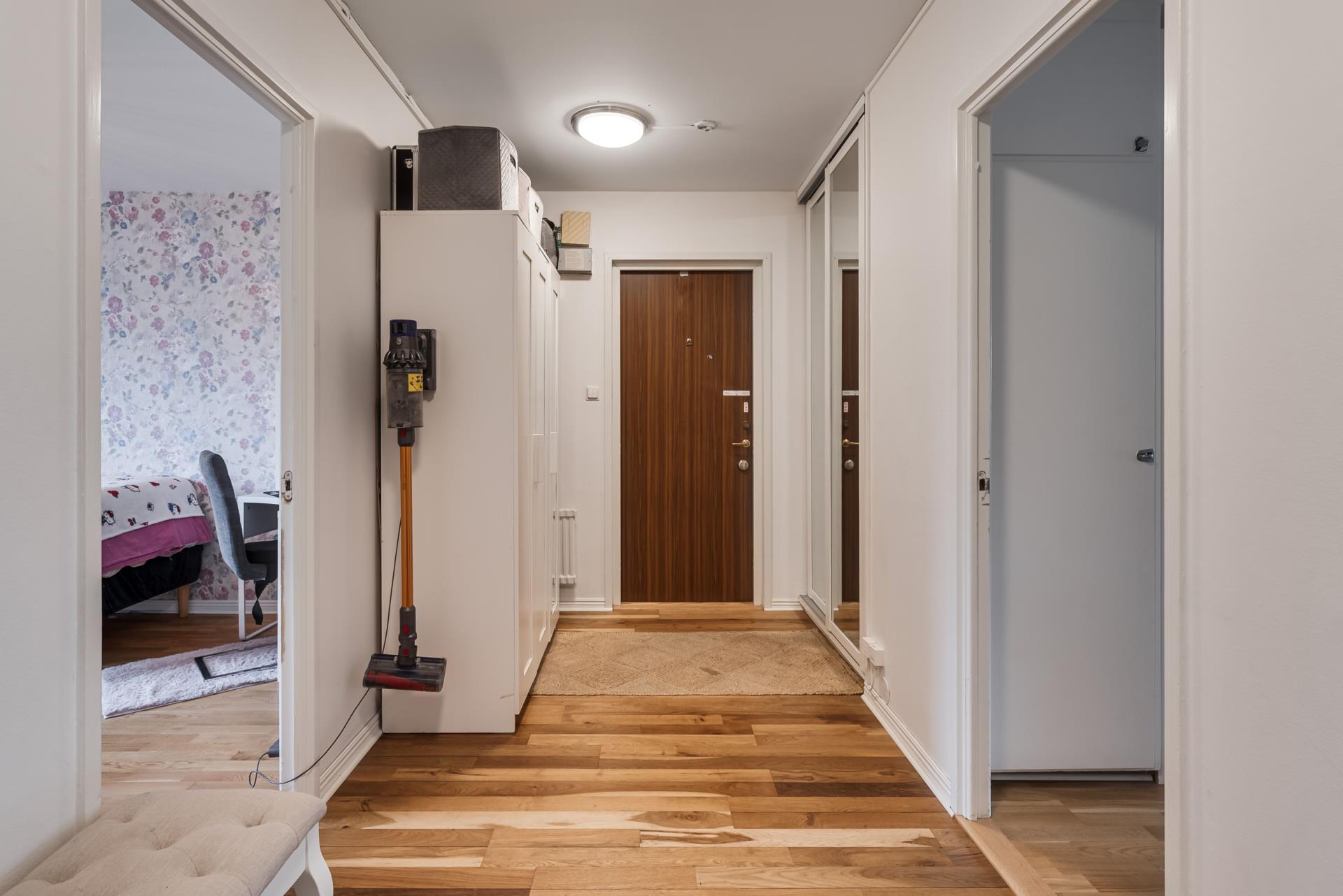 En fantastisk lägenhet med balkong där man kan sitta på eftermiddagen och njuta av kvällssolen. Du kommer in i en väl tilltagen hall med förvaring där dina två sovrum ligger på var sida om hallen. I andra änden ligger köket på höger sida och vardagsrummet som har plats för både soffgrupp och matbord. I vardagsrummet hittar man även ena dörren till balkongen. Den andra dörren är från ett av sovrummen som är väl tilltaget med vackra garderober. Köket är smakfullt renoverat och fullt inrett med allt man behöver. Lägenheten finns i ett stillsamt område med närhet till affärer, skola, gym och universitetet samt busshållplats. Mellan huskropparna som tillhör föreningen finns ett grönområde med staket runt om där barnen kan leka säkert och man kan breda ut handduken på sommaren och njuta av solen eller ställa fram grillen efter jobbet och grilla sin kvällsmat. Hela området sköts föredömligt åter runt av föreningens vaktmästare.