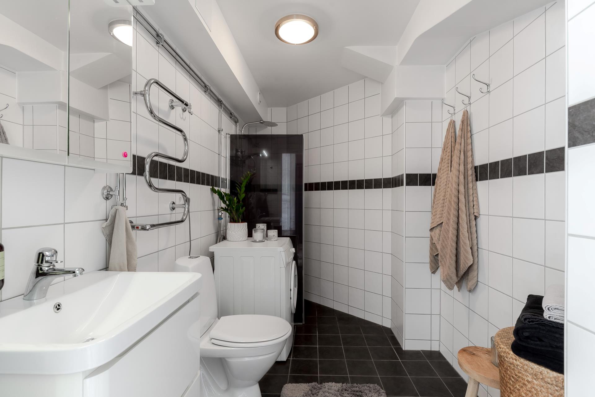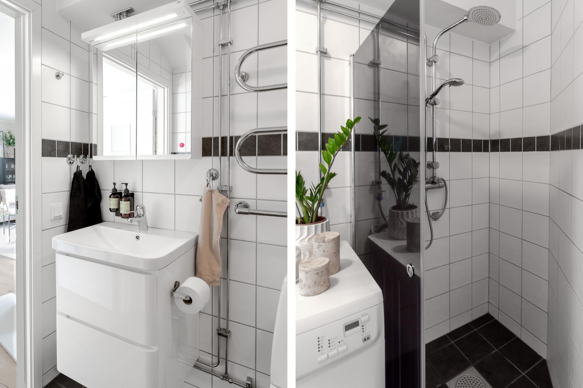 med kakel/klinkel, duschplats, wc och handfat